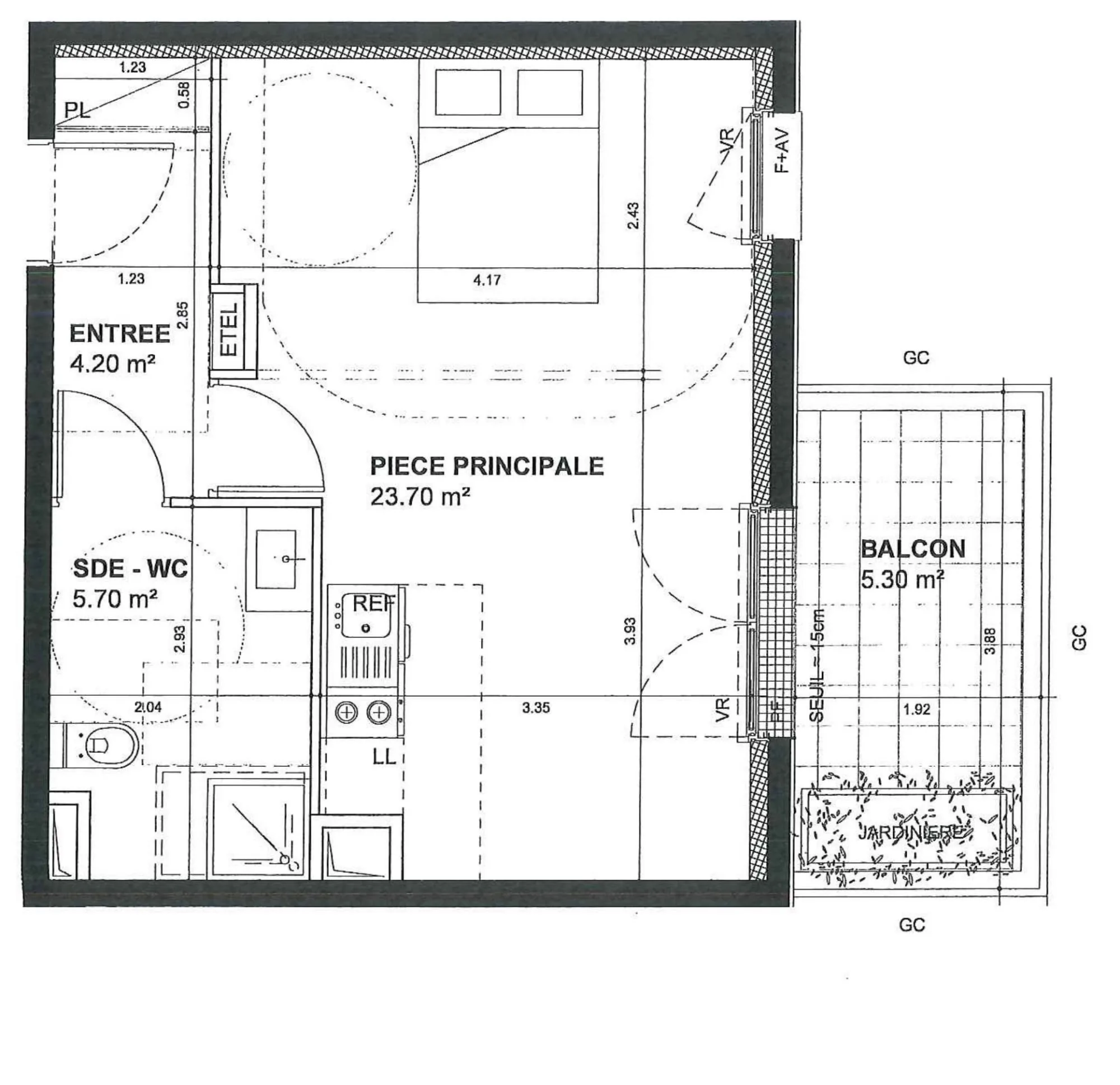 Le studio de 28 à 35 m² — le studio-T1 de facto. À partir de 28 m², on peut envisager une vraie séparation de l'espace nuit, même sans fermeture totale. Une verrière intérieure, une bibliothèque basse (1,20 m de hauteur) faisant office de claustra, ou une cloison partielle à 2,20 m de hauteur créent une zone nuit distincte sans couper la lumière. La cuisine peut être entièrement ouverte sur le séjour avec un IPN si un mur porteur sépare les deux. À ce niveau de surface, la question d'un couloir se pose — souvent je le supprime pour récupérer la surface, en intégrant les rangements dans la profondeur des cloisons. Un studio de 32 m² bien conçu vit comme un T2 de 45 m² mal pensé.